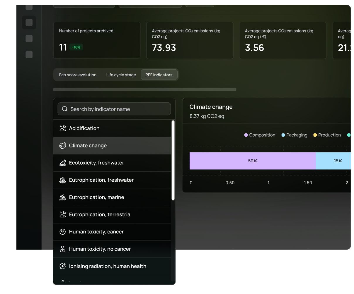 According to the European Commission's PEF standard on environmental labeling, we analysize at product-level and provide measurements for 16 impact categories.